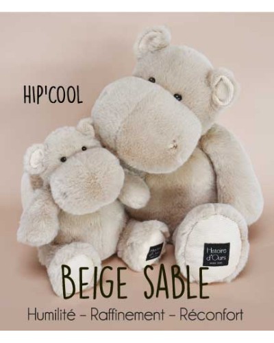 Avec cette collection HIPPO en couleur, le ton est donné: HAPPY, HAPPY ! Extrême douceur apaisante pour de bons petits câlins, bidon généreux, bonne bouille, son humeur est toujours TIP TOP pour avoir le sourire et partager une vraie histoire d'amour avec cet HIPPO HIP'COOL couleur beige sable. Pour jouer, cajoler ou décorer la chambre, c'est un cadeau de naissance idéal.